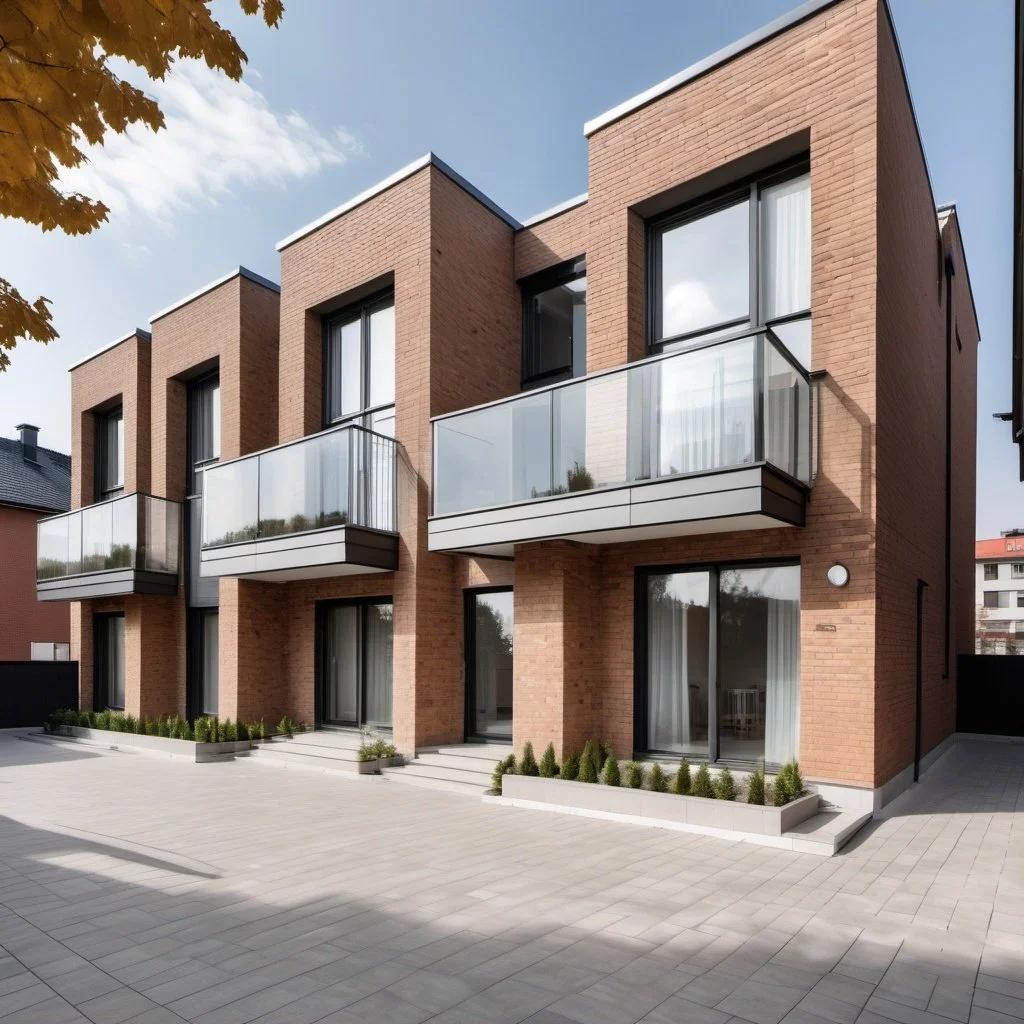 This elegant townhouse complex embodies modern living through architectural simplicity. The brick facade, paired with expansive glass windows and sleek balcony railings, creates a refined and sophisticated look. Each unit offers spacious balconies and large windows, allowing natural light to flood the interiors and fostering a seamless connection between indoor and outdoor spaces. The design emphasizes clean lines and high-quality materials, ensuring the building integrates harmoniously with its surroundings while showcasing a distinct contemporary charm.